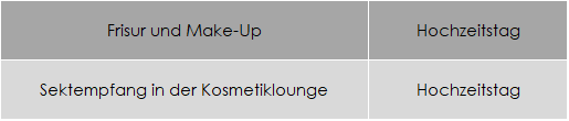 - Exklusivität: Unsere Kosmetiklounge gehört am Tag Ihrer Hochzeit nur Ihnen und Ihrer Begleitung.